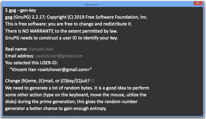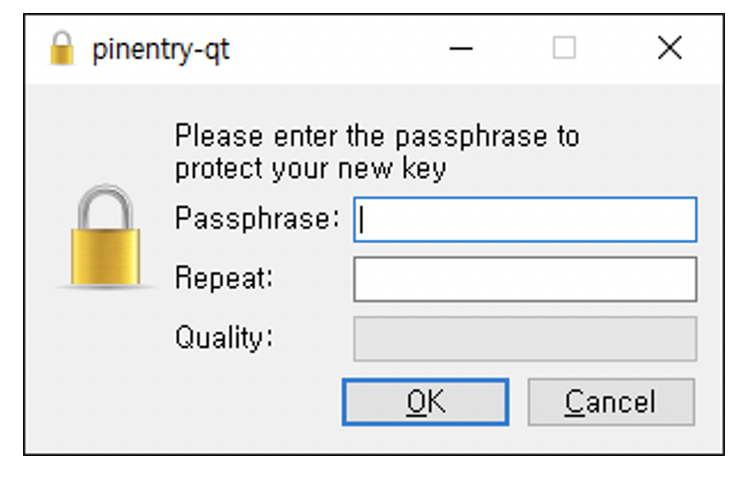 이름과 이메일 주소를 입력한 후에 Okay를 입력하면 다음과 같이 비밀번호(passphrase)를 입력하는 화면이 나타나다.
