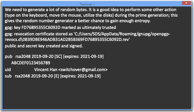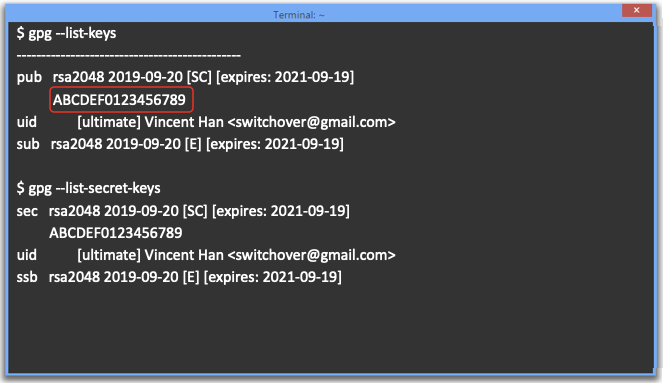 공개키는 "--list-keys" 옵션으로, 비밀키는 "--list-secret-keys" 옵션으로 확인 가능하며 실제 전자서명을 위해 해당 키를 사용하기 위해서는 ID를 사용한다. (위에서 ABCD...789가 ID이다)