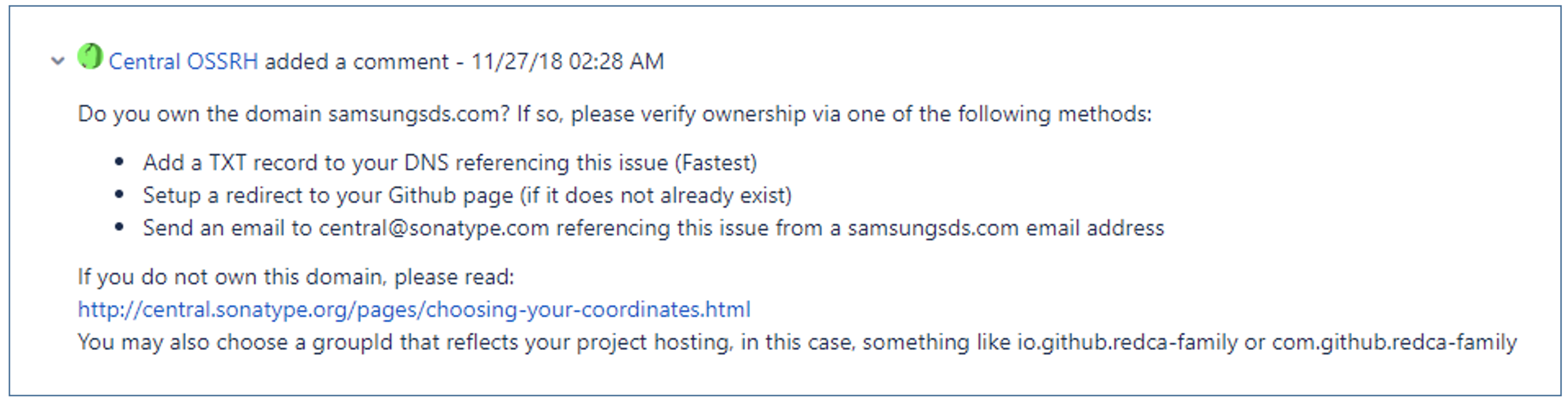 다음과 같은 방법으로 등록한 Group Id, 즉 도메인에 대한 소유를 확인해 달라는 것이다.