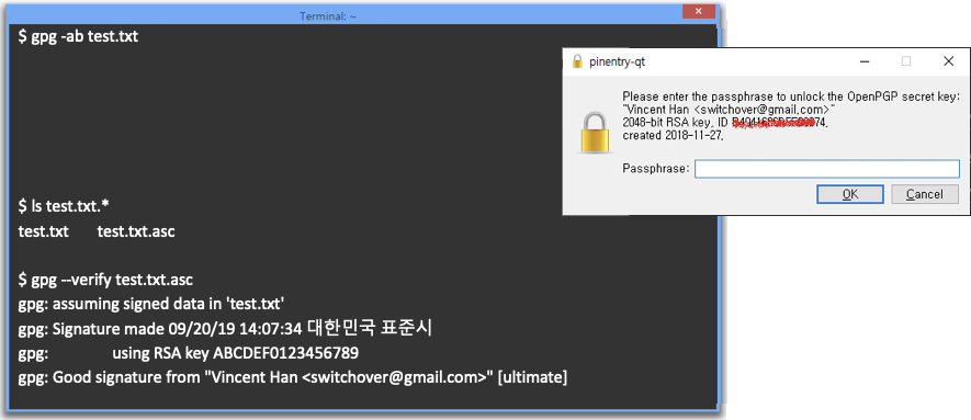 전자서명하고자 하는 파일명에 대하여 "gpg -ab [파일]"과 같이 실행하면 비밀키에 대한 비밀번호(passphrase)를 입력하는 화면이 나타나고 정상적인 비밀번호라고 하면 "파일.asc" 파일이 생성된다. 그리고 다시 "gpg --verify [파일.asc]" 명령을 실행하면 누가 전자서명을 했는지 이메일 정보와 함께 정상적으로 전자서명이 되었는지 확인이 가능하다.