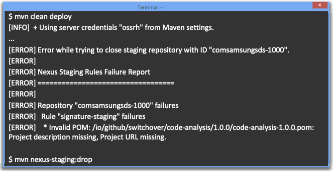 이 경우는 pom.xml에 프로젝트에 대한 URL 정보가 등록되지 않았다는 오류로 배포가 거절된 경우이다. 이런 경우 "mvn nexus-staging:drop" 명령을 통해 Staging Repository에서 삭제를 해주는 것이다.