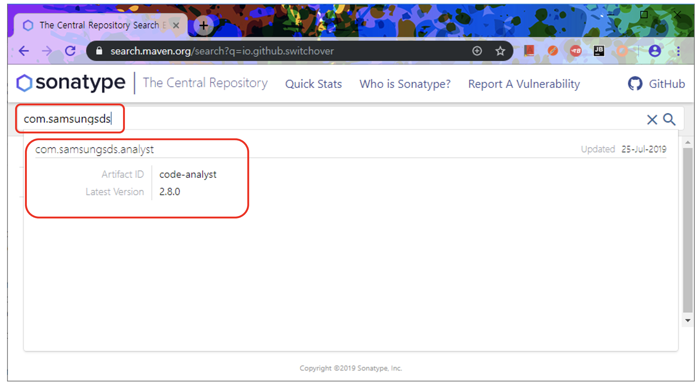 그리고 2시간 후에 https://search.maven.org 검색 사이트를 통해 다음과 같이 확인을 할 수 있다.