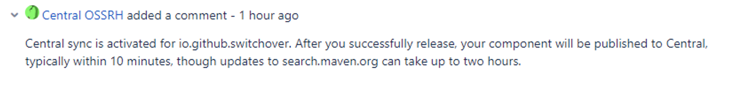 정상적으로 릴리즈 처리가 되었다면, JIRA issue(ticket)에 다음과 같이 comment를 등록하면 된다. 그래야 Central Repository와의 동기화가 설정된다.