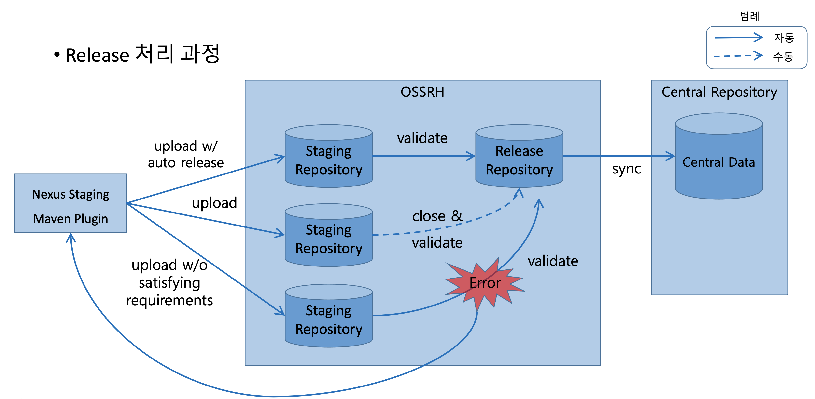 Staging Repository에 upload가 된 이후, 수동 또는 자동 설정(autoReleaseAfterClose 설정)에 의해 Central Repository 등록 가능한지 validation 단계를 거친다. (예를 들면 pom.xml에 최소한의 정보가 등록되었는지, javadoc / sources jar도 등록되는지 등)