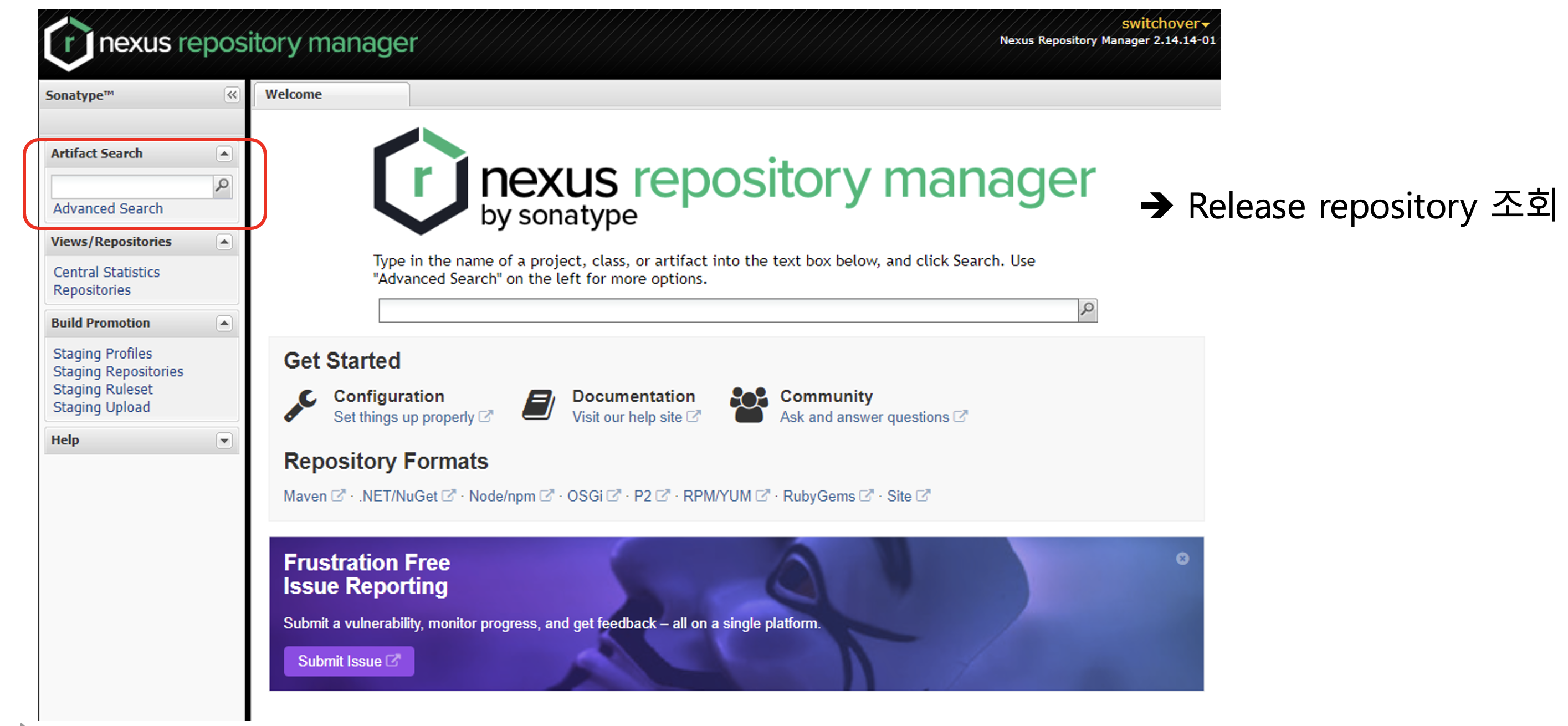 정상적으로 릴리즈까지 되었다면 https://oss.sonatype.org/에서 다음과 같이 검색을 통해 배포를 확인할 수 있다.